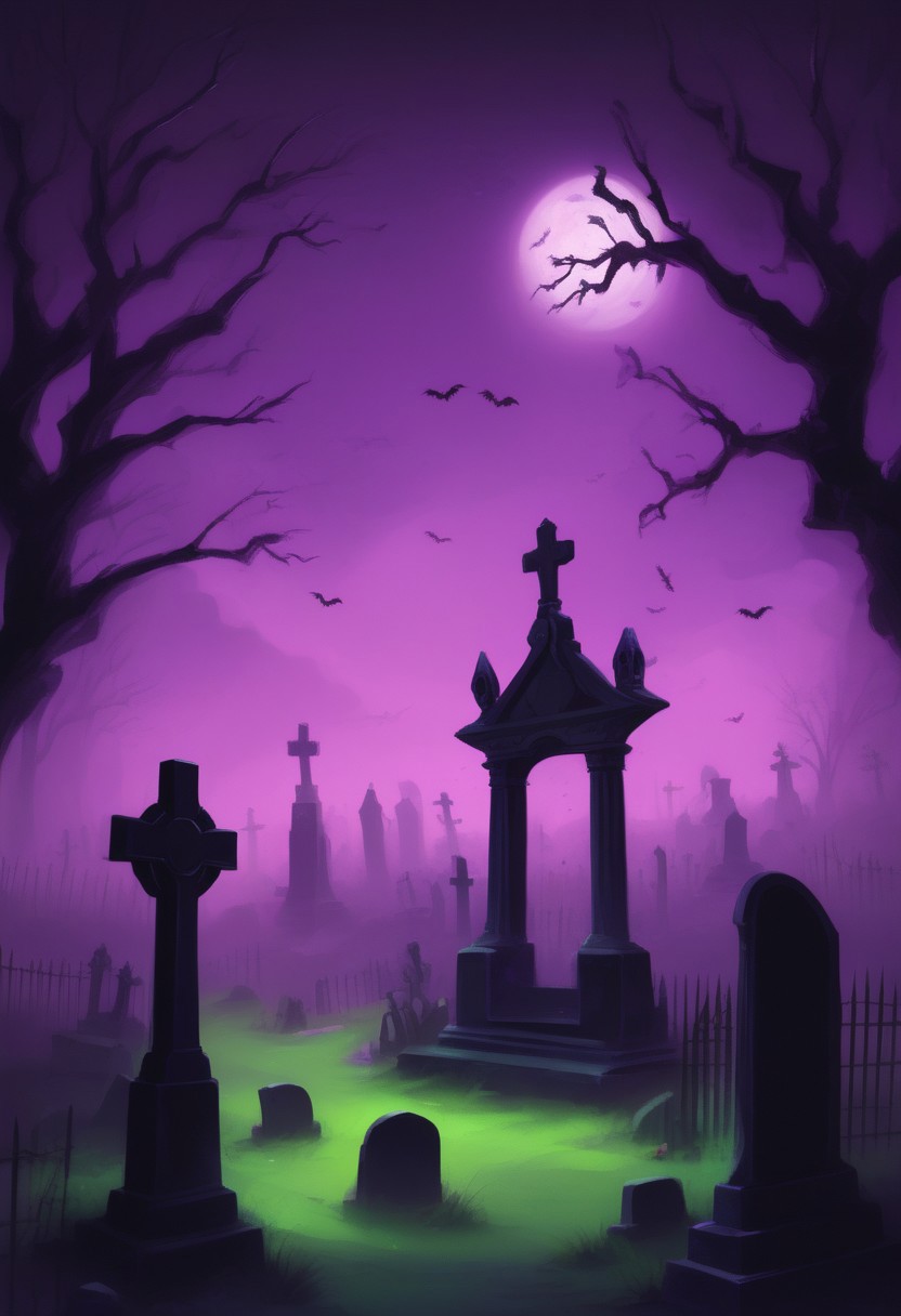 halloween theme, spooky graveyard with ghostly creatures and purple sky, higlights are green and black colors, cartoon style, mobile wallpaper, hyper realistic, ultra detailed