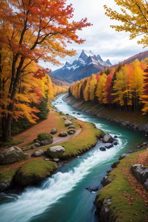 Fantasy Landscape, Autumn Forest, deep snow Mountains, Large landscape, castle on top of mountains, rushing river flowing