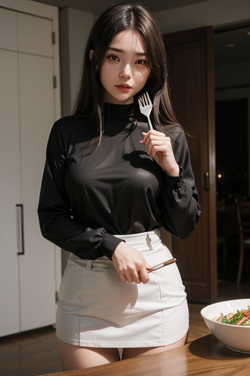 ((asian girl)),((girl wearing black shirt, holding a fork, food dish)), restaurant, bright theme, ((ultra-detailed)), (highly detailed CG illustration),(expressionless), (best quality:1.2),(1girl:1.2),High quality texture, intricate details, detailed texture, High quality shadow, thin lips, brown eye pupil, depth of field, perspective,20s, (big eyes:1.2),blush,perfect body, lean body, (narrow waist:1.3), large breast, distinct_image, (lustrous skin), solo focus, (brown hair), (streaked hair), ((long hair)), <lora:add_detail:0.5>, <lora:GoodHands-vanilla:1>, <lora:detailed_notrigger:0.7>, <lora:picxer_real:0.7>, <lora:zyd232_ChineseGirl_v4_2:0.6>, <lora:010:0.4>, <lora:FilmVelvia3:0.8>