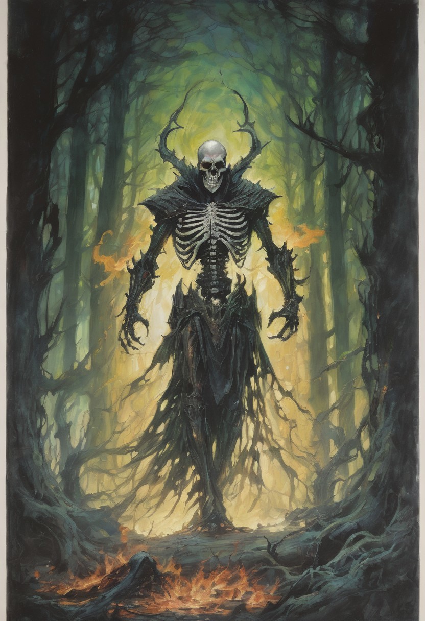 Frank Frazetta fantasy oil painting, R3tun4L style, skelenecro, cinematic lighting, insane details, close-up, 64-megapixel DSLR. scene in a sketch-like style with thick, bold lines. The focus is a close-up of a charming skeleton necromancer’s skull, engraved with glowing eldritch symbols that blend medieval magic and futuristic sci-fi. His hollow eye sockets blaze with green and black eldritch flames. wears ancient rusted heavy medieval armor. The glowing runes on his bones pulse with energy, radiating a dark power. Atmospheric haze surrounds the scene, heightening the contrast between the deep blacks of the background and the vibrant flames of his eyes. eerie misty dark forest cemetery background