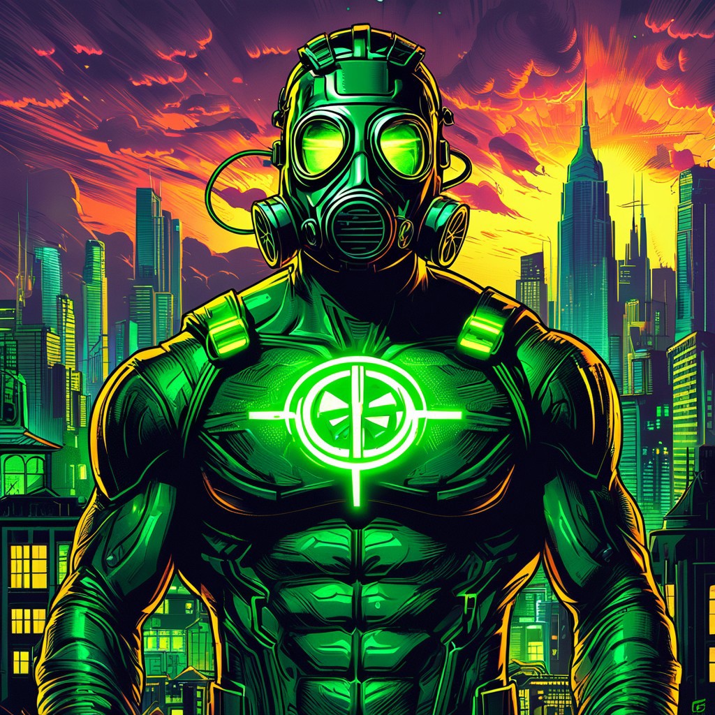 score_9, score_8_up, score_7_up, style of Dan Mumford, Full body, Solo, 1man, Superhero, (neon green and black power suit: 1.0), (power pose: 1.0), (radiation symbol on chest: 1.0), (superhero physique: 1.0), heavily muscled, (gas mask: 1.0), green energy, city background, science fiction, dark and vibrant, detailed linework, bold colors, dynamic, masterpiece, detailed,