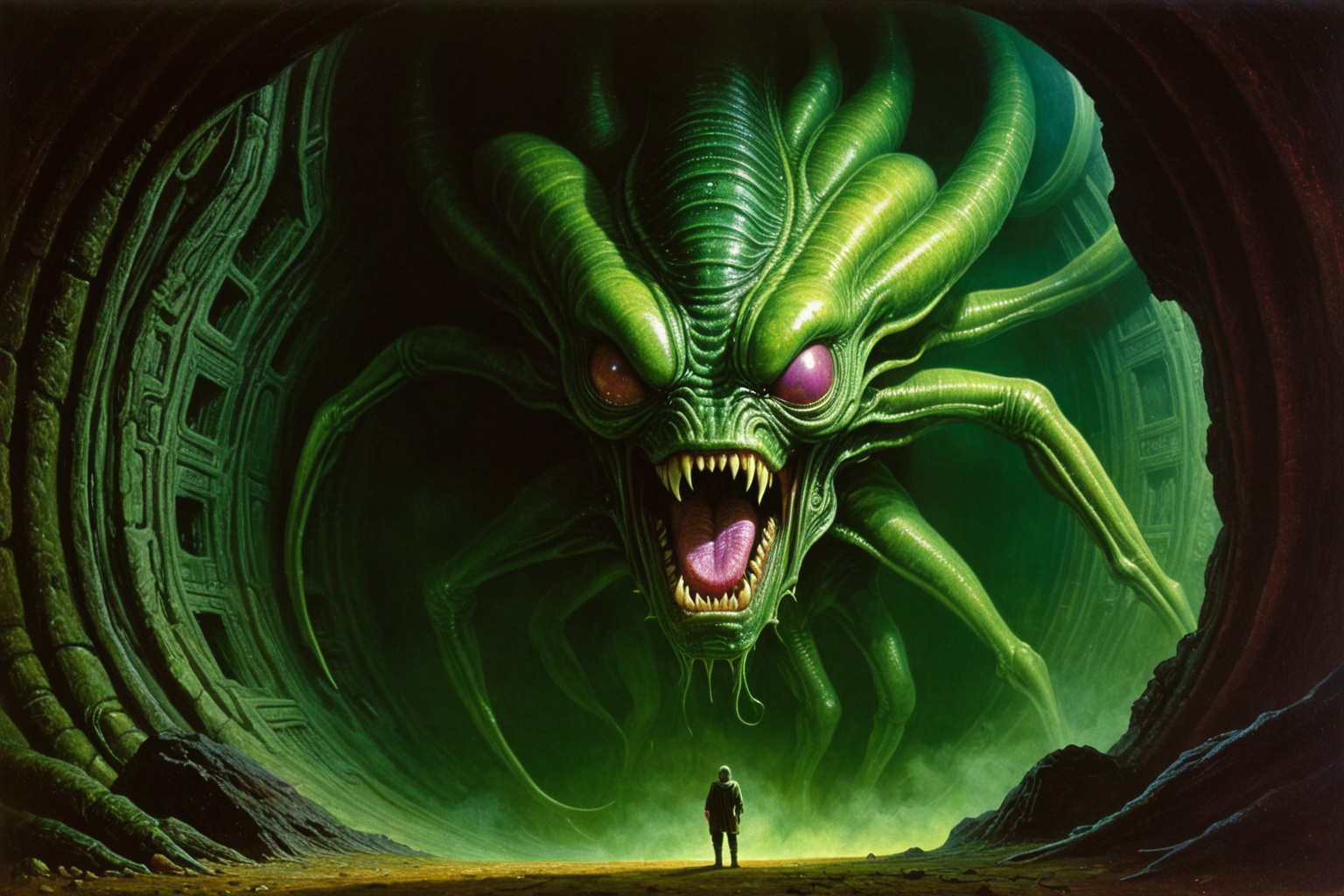 You stand inside the belly of the beast, surrounded by pulsating walls of sinew and muscle, stretching into endless, labyrinthine corridors. The ground beneath your feet is soft, spongy, and warm, with the occasional crunch of bone underfoot. The air is thick with the stench of decay and the sound of rhythmic, unsettling breathing. Strange, alien symbols are etched into the flesh-like surfaces, glowing faintly in hues of sickly green and violet, creating a disorienting, dreamlike atmosphere. Lighting is dim and atmospheric, creating deep shadows and highlighting the visceral textures. Artists: H.R. Giger, Zdzislaw Beksinski, Moebius, Wayne Barlowe., best quality, masterpiece, painting, concept art, absurdes, alien, aliencore, suspenseful, deep vibrant colors, color contrast, volumetric fog, light particles, deep colors, no gradients, high resolution, close-up, , <lora:marcXL:0.35> <lora:Kodak Motion Picture Film Style v5_2:0.4> Kodak Motion Picture Film Style <lora:Liam Wong Style:0.4> Liam Wong Style page <lora:d\EnvyZoomSliderXL01:0.5>