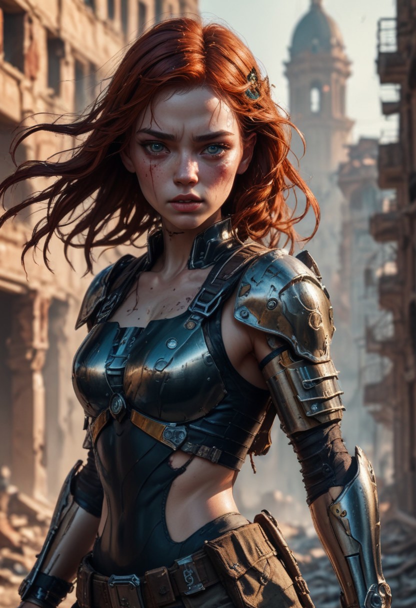 High resolution ultra-realistic of Beautiful Post-Apocaliptic warrior girl, cinematic lighting, Post-apocalyptic style, ultra realistic, fighting stance, Post-apocalyptic woman, standing among the ruins of buildings, 8k, Greg Rutkowski, Intricately Designed Handsome dirty bloody face, wavy red hair, Realistic beautiful blue eyes, Intricately designed Post-apocalyptic modern combat equipment, full body, athletic figure, Beautiful Sadie Sink as Postapocalyptic Soldier in modern combat equipment, beautiful firm Breasts, defiant and seductive, wet oily shiny skin, ultra detailed, (Intricately Designed dirty face: 1.3), Cinematic clorful lighting, realistic body and face, Photograph Taken on Nikon D750, Intricate, Elegant, Digital Illustration, Scenic, Hyper-Realistic, Unreal Engine, CryEngine, Octane Render, Artgerm, WLOP, Greg Rutkowski, 8k ultra high resolution concept art, hyper-defined, sharp focus, echoing, (hyperdetailed body and face: 1.3), Atrractive, Atrractive 21 years old woman, attractive bust girl, asymmetric balance