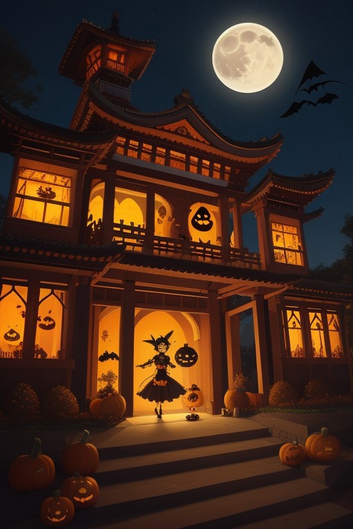 A magical Halloween night scene featuring glowing jack-o'-lanterns with intricate carvings, softly lit by a mystical halogen light. The night sky is dark with a full moon and bats flying across. Cute, chibi-style characters in colorful costumes, holding baskets filled with candies. Incorporate subtle elements of East Asian culture, such as lanterns or traditional patterns on the costumes. The atmosphere is festive yet slightly eerie, with scattered autumn leaves, playful ghosts, and a mystical vibe blending the whimsical charm of Halloween with a touch of the East.