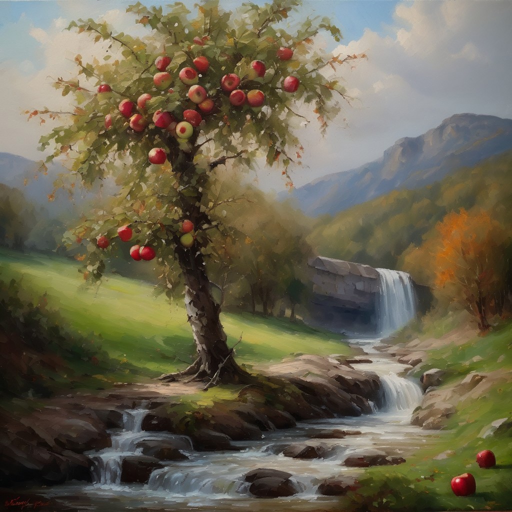 Oil painting, masterpiece, regal, fancy. An apple falls very far from the tree.