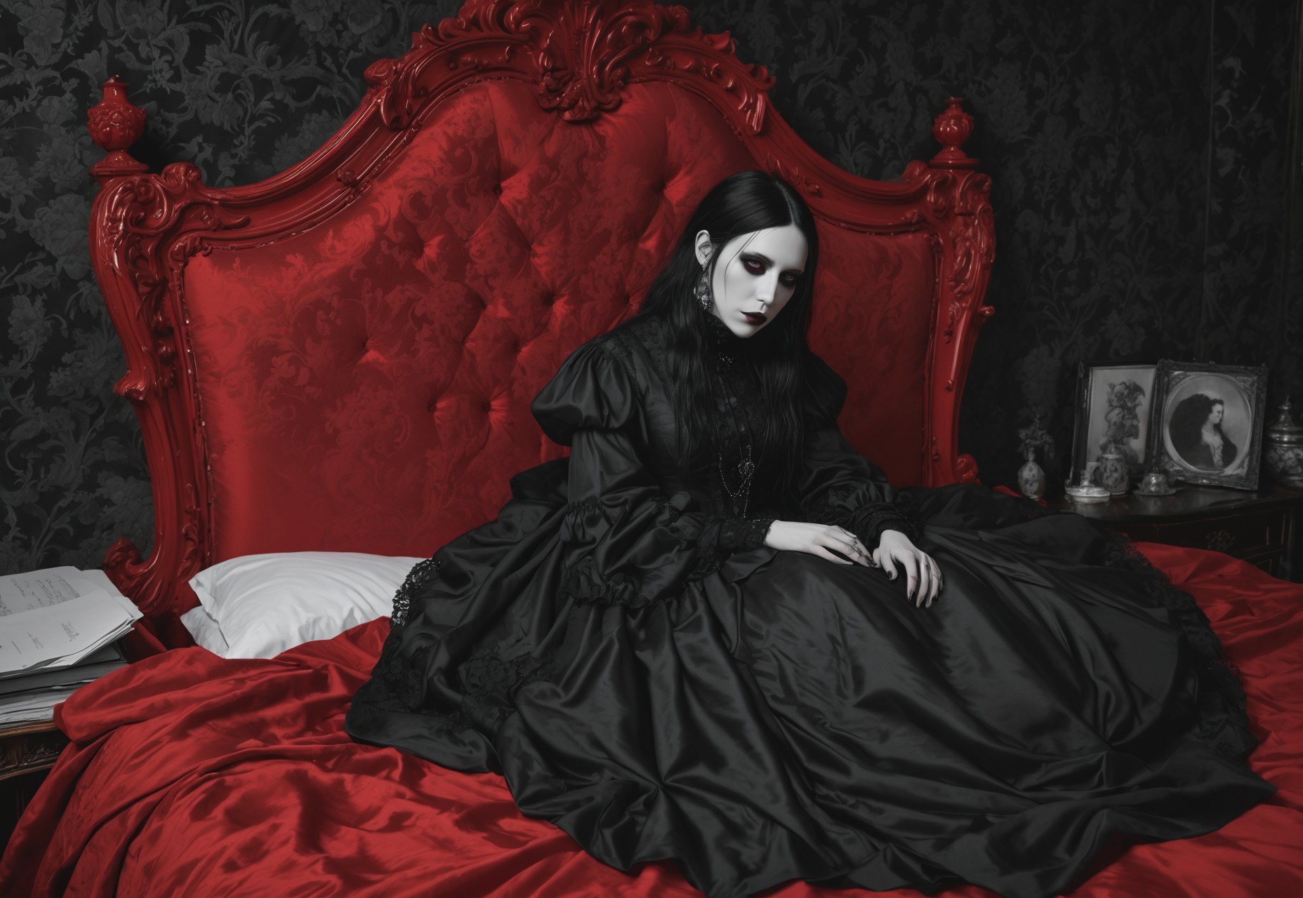 score_9, score_8_up, score_7_up, score_6_up, Blame! by Tsutomu Nihei the goth-queen chelsea wolfe is laying in a red baroque bed filled with sheets, eyes closed, grinning in the camera easynegative, ng_deepnegative_v1_75t, 8k, highly detailed,