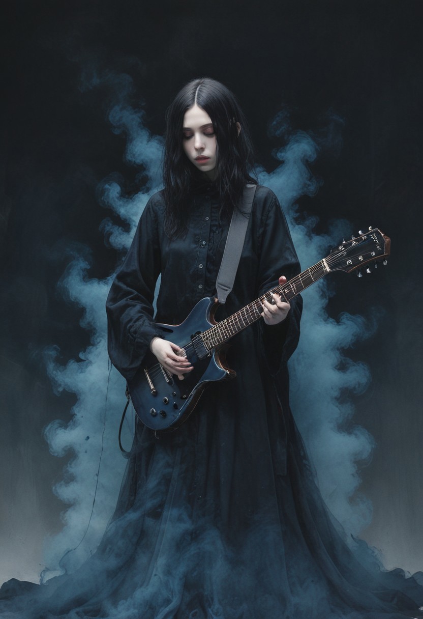 score_9, score_8_up, score_7_up, score_6_up, Blame! by Tsutomu Nihei singer chelsea wolfe is standing with a guitar in blue smoke easynegative, ng_deepnegative_v1_75t, 8k, highly detailed,