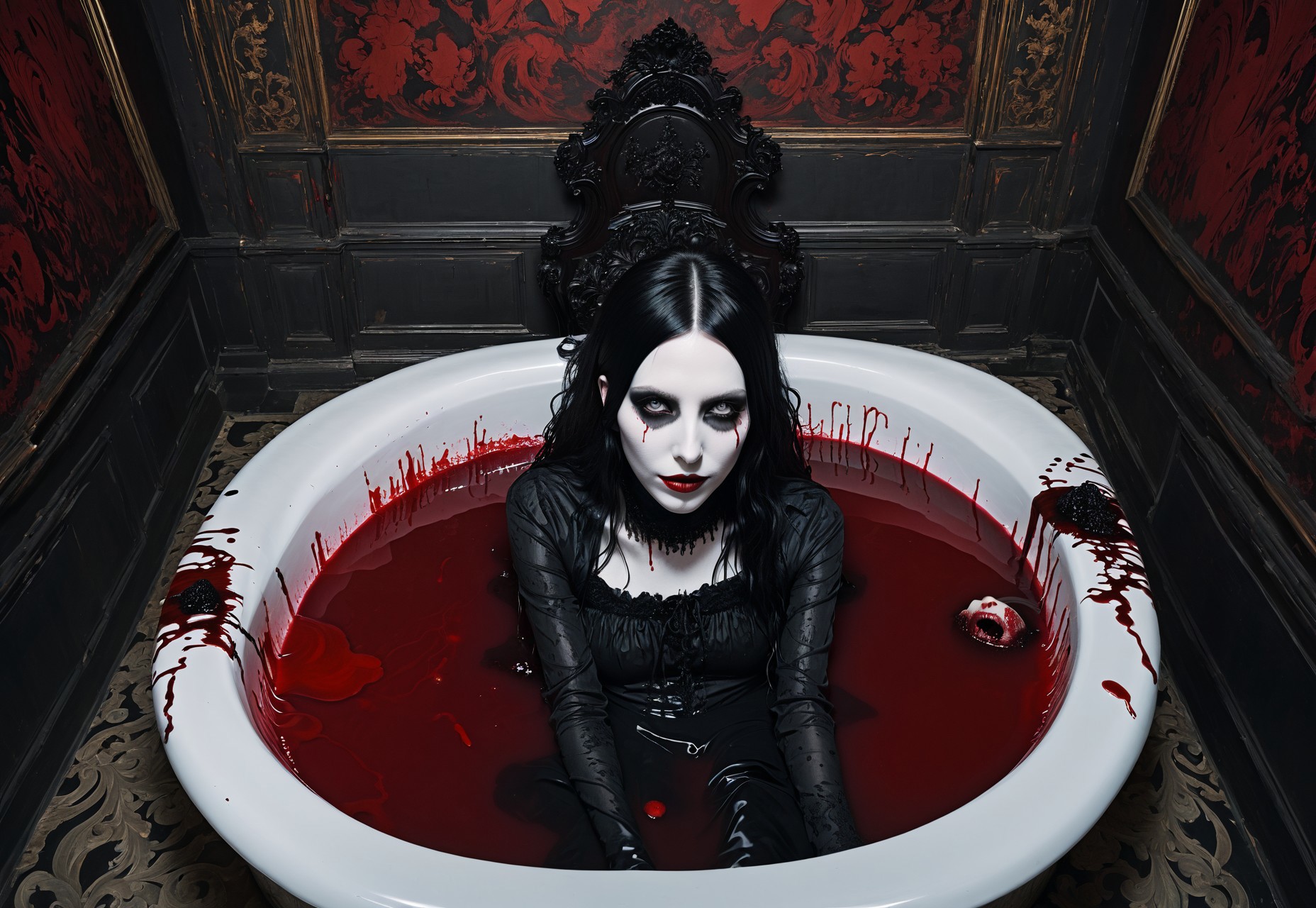 score_9, score_8_up, score_7_up, score_6_up, Blame! by Tsutomu Nihei the goth-queen chelsea wolfe is laying in a baroque bathtub filled with blood, smiling in the camera easynegative, ng_deepnegative_v1_75t, 8k, highly detailed,