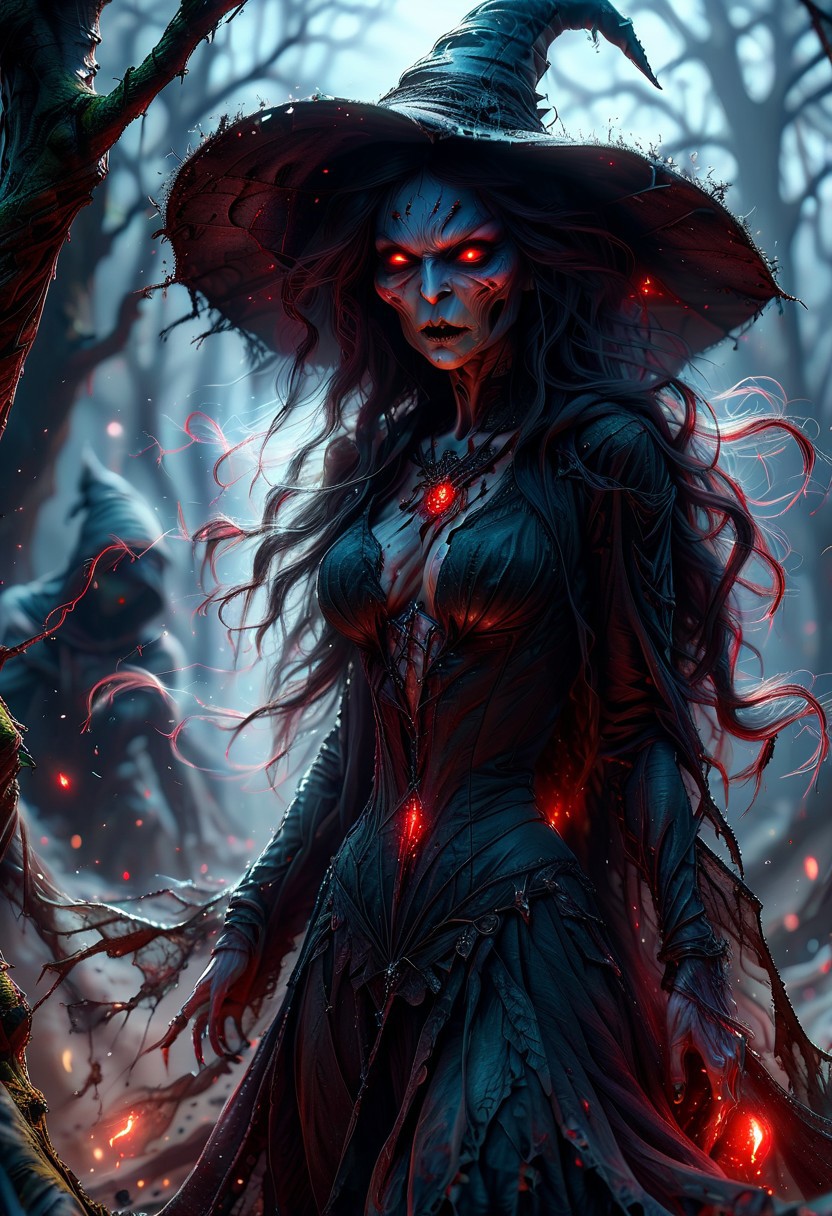 full body portrait, A wicked, enchanting woman with sharp, alluring features and flowing, raven-black hair stands in a twisted, ominous forest. Her black dress, tattered and elegant, clings to her figure, and a tall, pointed witch’s hat casts a shadow over her piercing, glowing eyes. The dark forest is filled with dense spiderwebs, and the glowing red eyes of unseen creatures lurk in the shadows. The full moon casts an ethereal light, illuminating the tangled branches and thick fog that creeps along the forest floor. ral-wtchz, Vivid, Long, hkmagic, many details, 8k
