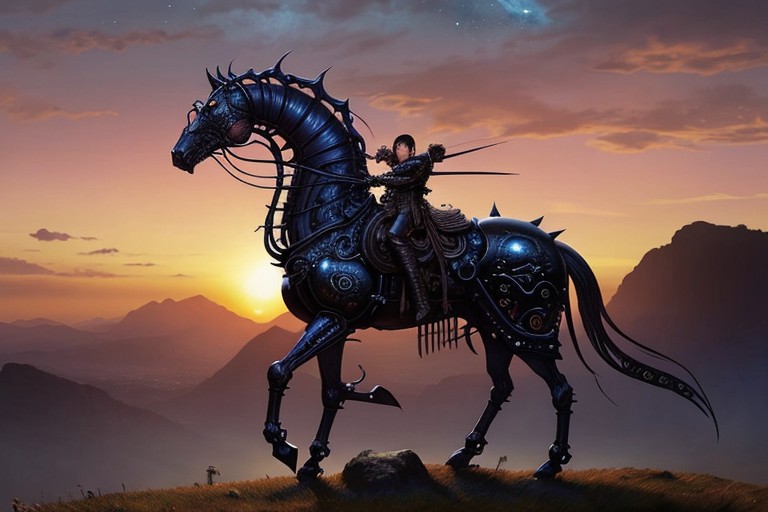 Style: Van Gogh's Starry Night, Expressionism Vibes: Gloomy, Dark Tones, Emotional Depth Themes: Dark Fantasy, Fantasy Quality: Vibrant Masterpiece, 8k, UHD, Very Detailed, High-Quality, Best Artist, Sharp Edges, Detailed Textures, Full View, Atmospheric Lighting, Stunning Visuals Elements: Surreal, Iron Maiden Knight with metal spikes all over body, Mechanical Eldritch Samurai with an oversized sword, organic, organic sculptures, bio-organic, horse sculptures View:Side view, staring into the distance Background: Exotic vegetation, Pink and yellow sun in the background Influences: Norman Rockwell, Greg Hildebrandt, Tristan Eaton, Victo Ngai, Greg Rutkowski, Beksinski Color Scheme:Triadic, Vibrant Colors Mood: Staring into the void, high contrast Miscellaneous: A still from the film Alien, Eldritch machines, Biomechanical Additional Enhancements:<lora:MJ52:0.5> <lora:add-detail-xl:1> <lora:ral-ertmsphr:0.5>