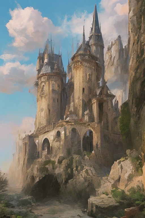 medieval fantasy tower spiraling towards the sky, daylight sun touches the landscape, colorful sky