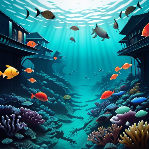 A sprawling underwater city, with tall, glowing buildings made of translucent materials. Schools of fish swim gracefully through the streets, and strange sea creatures glide by in the background. The city is lit by bioluminescent lights, casting an otherworldly glow through the deep blue water. The scene feels surreal, beautiful, and full of mystery, with the sea life coexisting peacefully with the city’s inhabitants