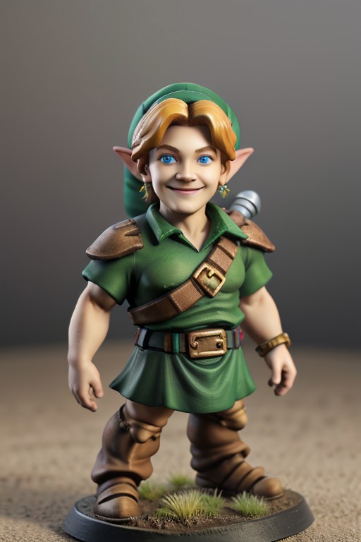 younglink, boy, blonde hair, blue eyes, hat, pointy ears, green tunic, belt, looking at viewer, smiling, standing, hands on hips, extreme detail, hdr, realistic quality, analog, <lora:YoungLink:.8> <lora:miniaturesV02:1>miniatures