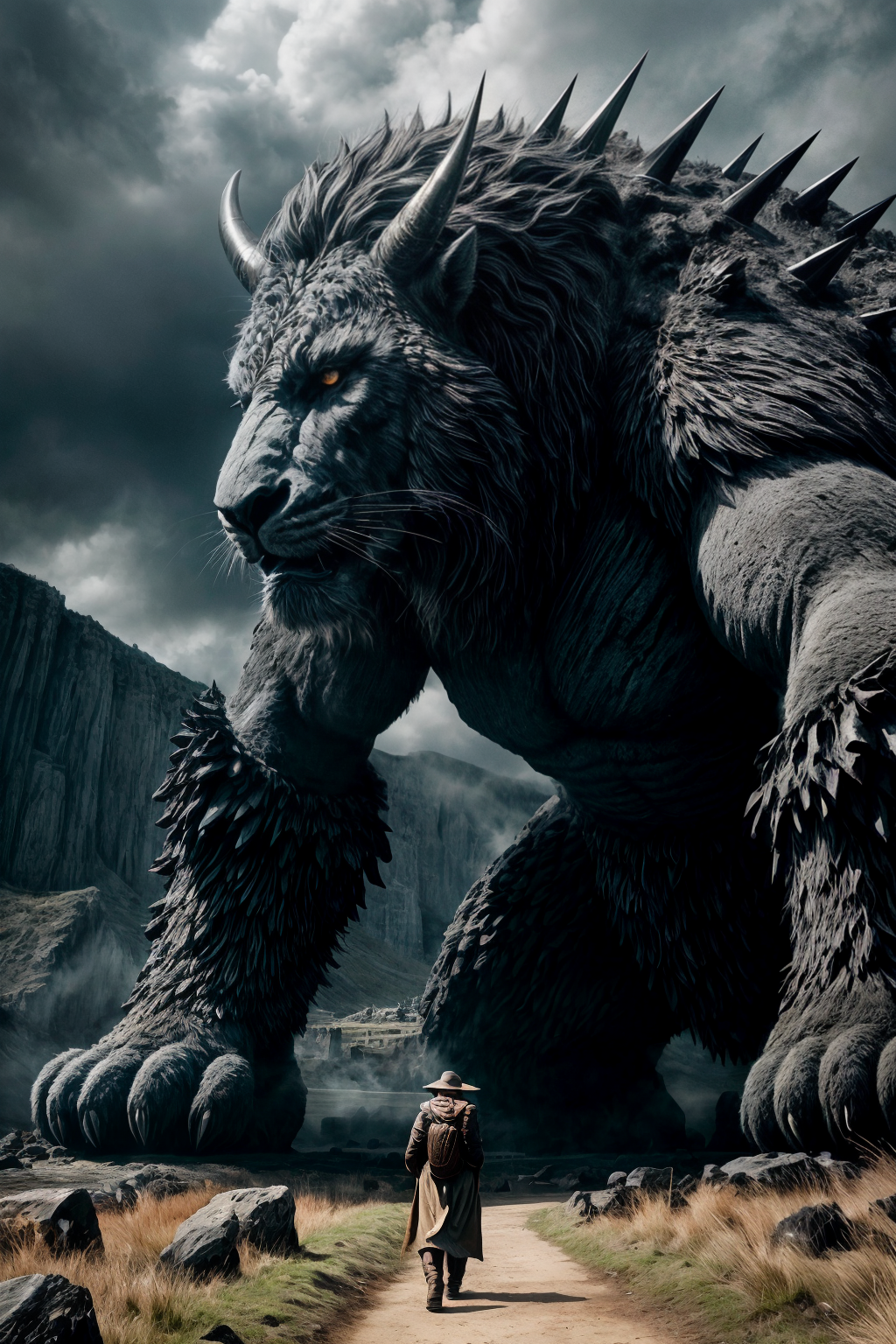 In this striking piece, a colossal stone-made creature looms over the landscape with immense power and presence. The beast is composed primarily of massive stones that give it an imposing structure, as if carved by ancient hands from the very earth itself. Volcanic rocks are intermingled within its body, lending an ominous hint to its fiery nature and tremendous strength. Sharp stone spikes adorn its formidable frame, giving it a fearsome appearance that evokes both fear and awe in those who behold it. This incredible creature is rendered with exceptional detail, showcasing the textures of its rough skin and intricate patterns etched into each stone spike. The image conveys an atmosphere of ancient mystery, power, and primal force, as if capturing a glimpse of a long-lost age where titans walked among mortals.