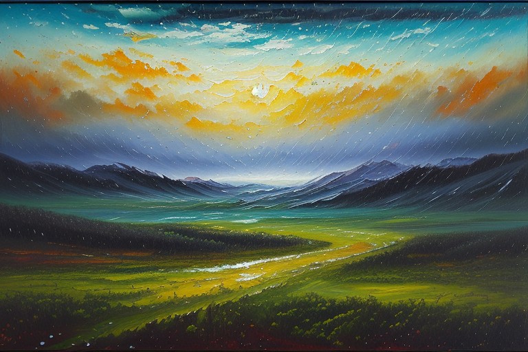 a complex expressive expressionism oil painting of a raining country landscape weather. the painting looks wet like the raining is coming out of the painting, Abstract art