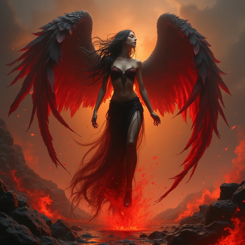 The fallen angel spread its huge wings, and dark red light emitted from the wing feathers. Her body and skirt seemed to be made of hot volcanic lava. The lava flowed slowly, and the surface was glowing with flowing light. Her hair was dancing in the wind like burning flames, black flames were burning everywhere, and thick red smoke was swirling around her.
