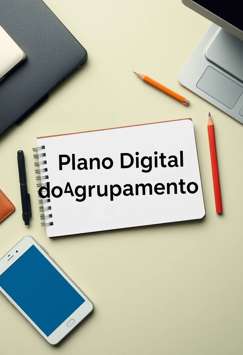 Ultrarealistic poster featuring a notebook, pencil, computer, cell phone and tablet as a background. in the center the text appears: "Plano Digital do Agrupamento"