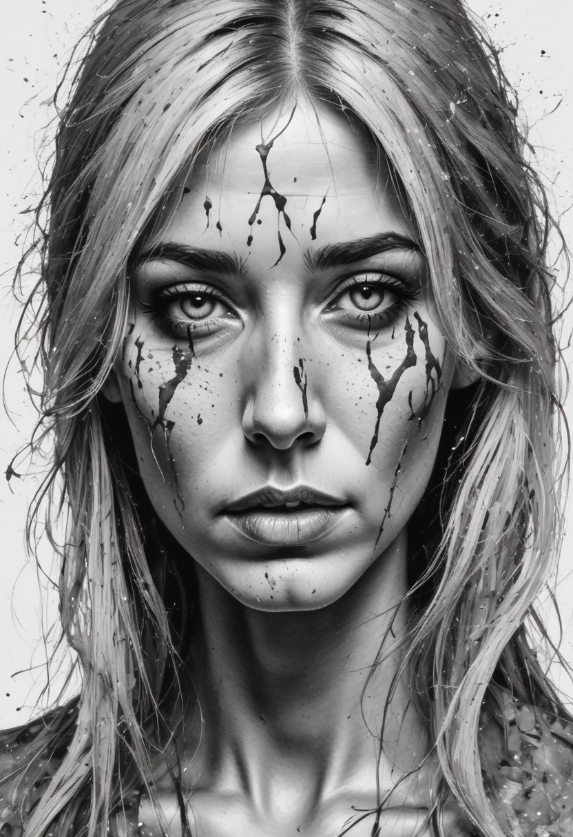 Dark, moody, stressed, horror, splash of black oil, oil painting, black and white, black to white, model, woman, tired, old face, stressed, aggressive, angry, long white hair, bangs, breasts, black hair, cleavage, medium breasts, upper body, extreme big lips, high cheekbones, big head, long nose, green blouse, freckles, small nose, paint splatter, paint, pop art style, dim colors, bold outlines, popular culture themes, ironic or kitsch, absurdness, masterpiece, 8k, high detail, intricate, best quality