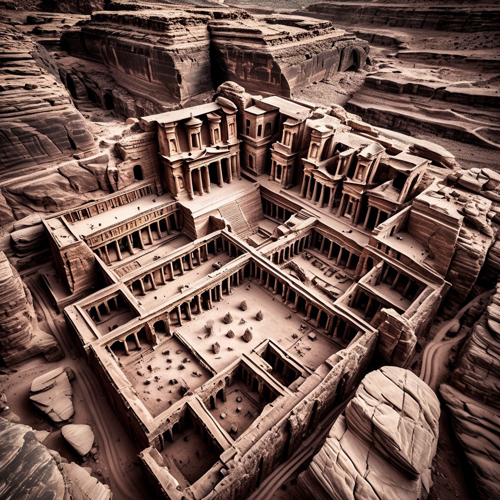 Bloom light,ancient ruins of Petra are a testament to the ingenuity of the Nabateans, who carved an entire city out of the rock,Sphynx Cat,angle from above,detailed masterpiece most beautiful artwork in the world Ultrarealistic,Surrealist art Dreamlike mysterious provocative symbolic intricate detailed,Canon R5,Monochrome Black and white contrast tone texture detailed