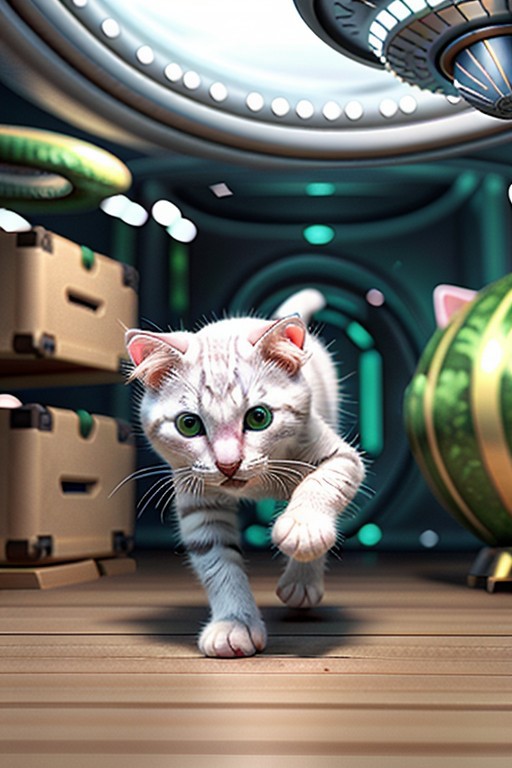 Capture a full hyper-realistic photograph of an adorable white kitten running in an alien spaceship being chased by green aliens, cutest in civitai, side view, chubby cat, short legs, close up, c4d, blender, raytracing, unreal engine 5, render 3d,