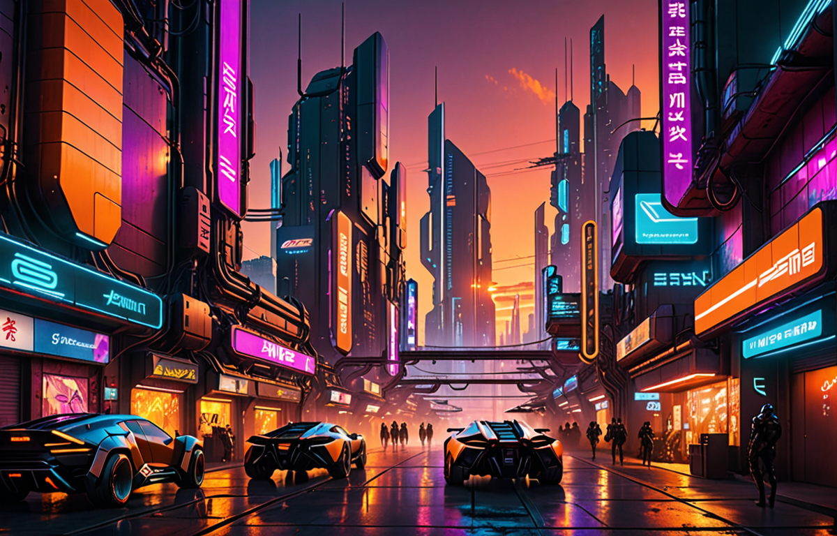 A cyberpunk metropolis at sunset, orange skies blending with neon glows, sleek futuristic architecture, hovering vehicles casting shadows over dark alleys, digital advertisements lighting up the horizon.