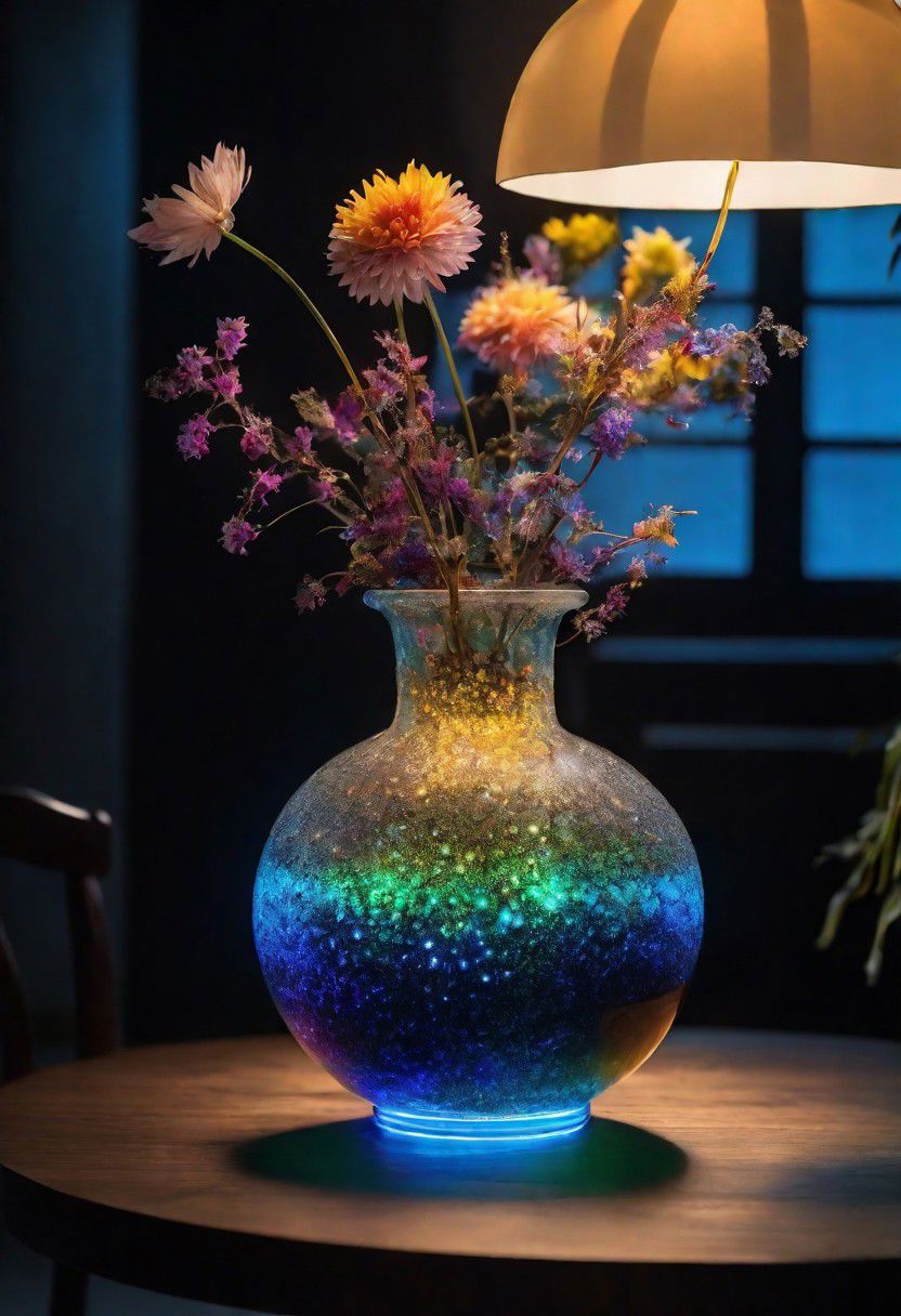 photography,masterpiece, a transparent pot and some flowers on the table,glowing Particle Effects,dark tone,colorful,texture,insane details,extreme resolution,from front side,upper body,8K, HDR,