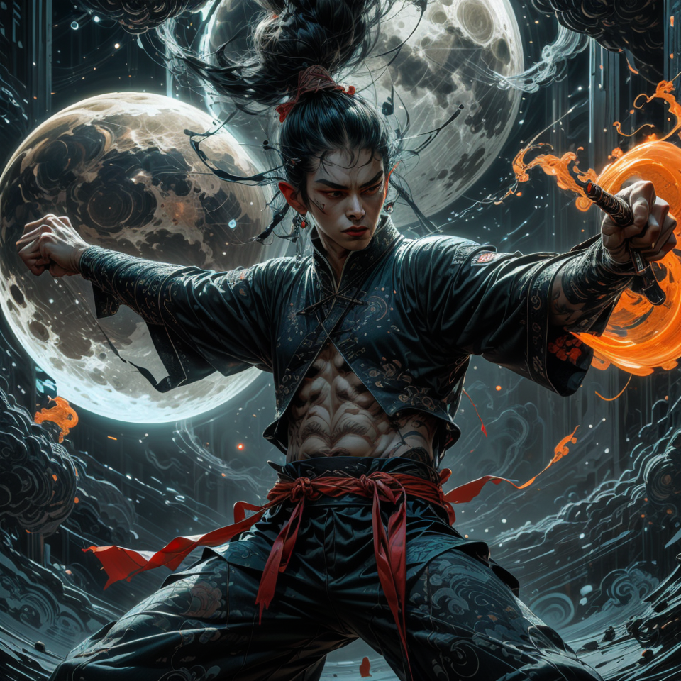fight between 2 man in space, sun, moon, explosion, wuxia, dragon, holding weapon, <lora:wuxia2:1>, <lora:J_diagram:0.7>, J_diagram, bioluminescent, <lora:xuer shang dynasty_20240212233835:0.7>, xuer shang dynasty, <lora:more_details:1>