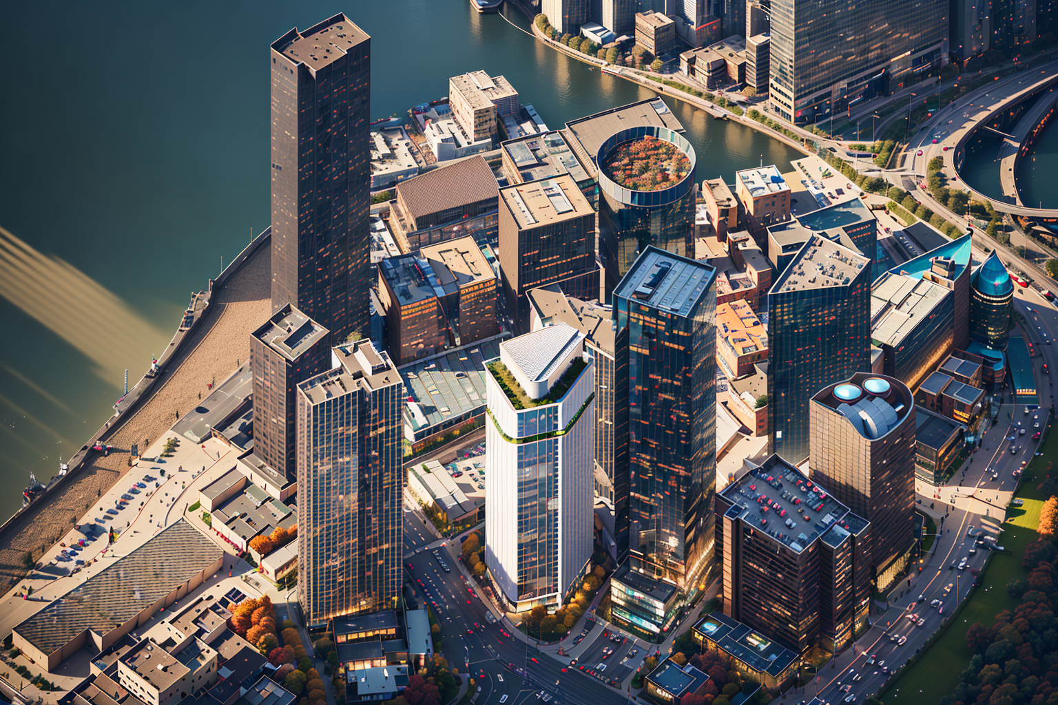 The surrounding buildings are made of glass , concrete, wood, brick, the urban heart pulses with diverse edifices, verdant retreats, and a mosaic of human life. Complex geometries capturing light, architectural variety, public parks, a living tapestry, dual-purpose structures, every corner alive with stories, vehicles, and souls on their twilight errands. BREAK A tender luminance bathes the scene. Long shadows stretch, telling tales of a city in twilight. Autumn's touch, man-made luminescence, layers of atmospheric haze. Warm light rays, reflection rendered with cinematic precision, volumetric, cinematic lighting. Nikon Z FX Tilt-shift, ISO 100, clarity personified, lens correction, 8K AND a (40 story skyscraper designed by Tadao Ando) that stands as a testament to human ambition and ingenuity, visible from the heavens, a fusion of modernity and mystique. As light dances upon the facade, the nuance of it's intricate geometry is magnified, detail shimmering with clarity <lora:UrbanScene_1024_test1:0.3>