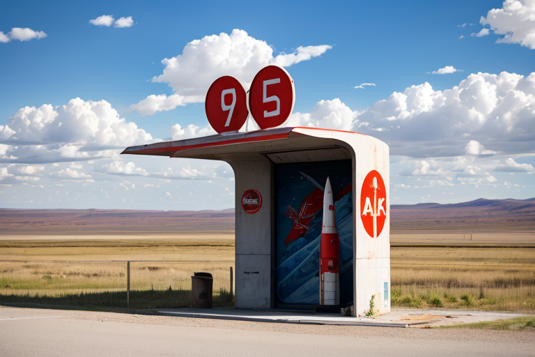 art installation, sculpture, futuristic shape, dilapidated soviet bus stop, large artistic mural depicting a rocket launch, sign, lettering, place name, lone road in the middle of nowhere