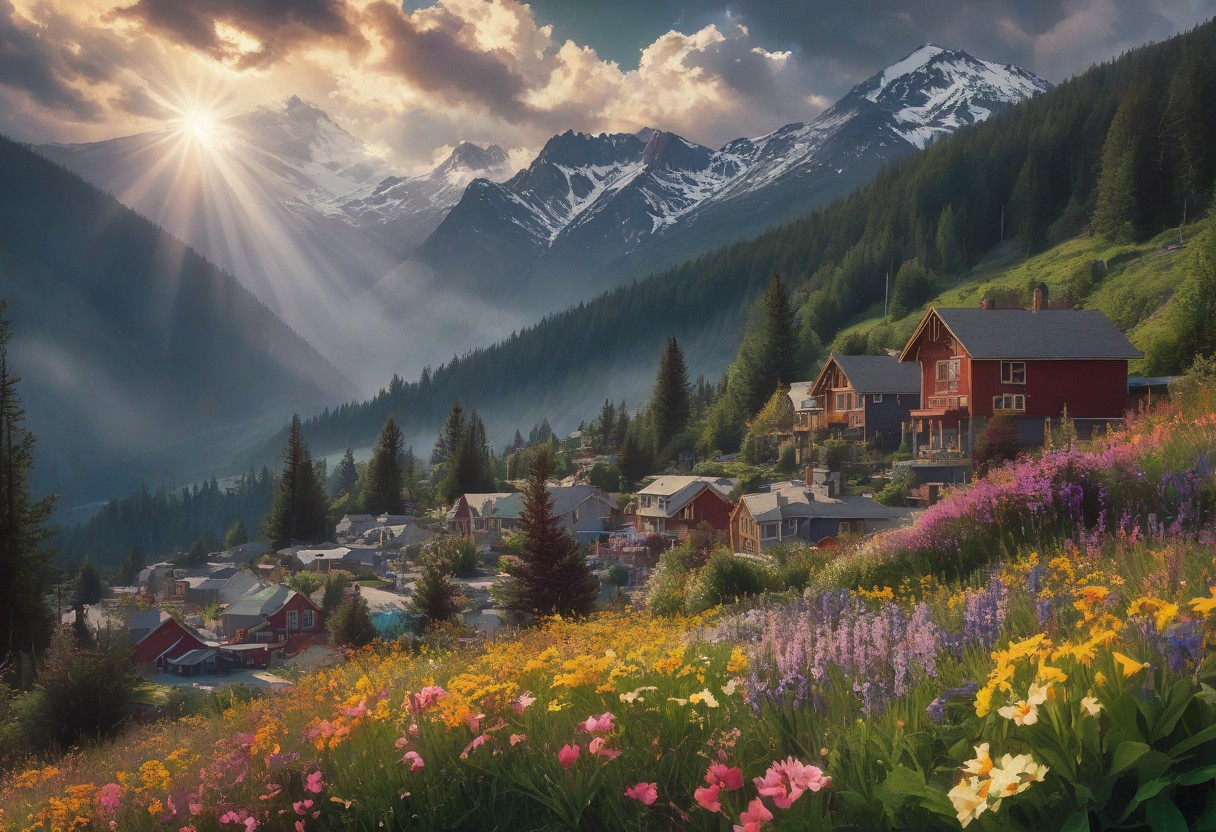 Roofs of British Columbia village, Pacific Northwest village, Rocky Mountains in spring, mountain wildflowers in bloom, atmospheric lighting, awesome mountainbackground, mountaintops wreathed by clouds, sun rays pouring from sky to village below, highly detailed, cinematicfantasy, dreaming, best quality, double exposure, realistic, whimsical, fantastic, splash art, intricate detailed, hyperdetailed, maximalist style, photorealistic, sharp focus, harmony, serenity, tranquility, excellent composition, finest details, highest aesthetics, strong muted Highlighter, vibrant light and colors, best quality sharp focus, high contrast, stylized, clear, natural colors, surreal, ultra quality, 8k, best quality, masterpiece, midjourneyv6.1