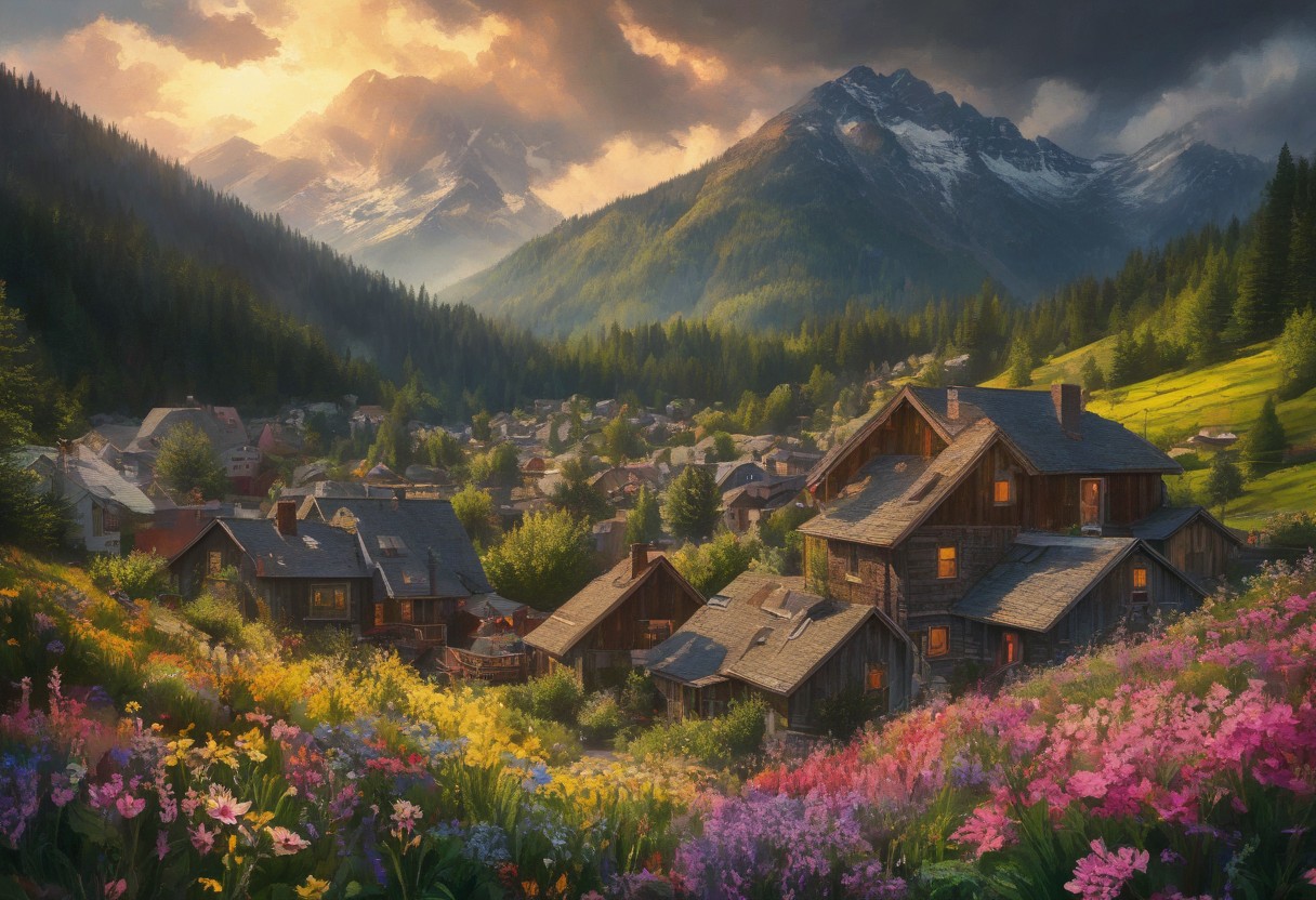 Roofs of British Columbia village, Pacific Northwest village, Rocky Mountains in spring, mountain wildflowers in bloom, atmospheric lighting, awesome mountainbackground, mountaintops wreathed by clouds, sun rays pouring from sky to village below, highly detailed, cinematicfantasy, dreaming, best quality, double exposure, realistic, whimsical, fantastic, splash art, intricate detailed, hyperdetailed, maximalist style, photorealistic, sharp focus, harmony, serenity, tranquility, excellent composition, finest details, highest aesthetics, strong muted Highlighter, vibrant light and colors, best quality sharp focus, high contrast, stylized, clear, natural colors, surreal, ultra quality, 8k, best quality, masterpiece, midjourneyv6.1