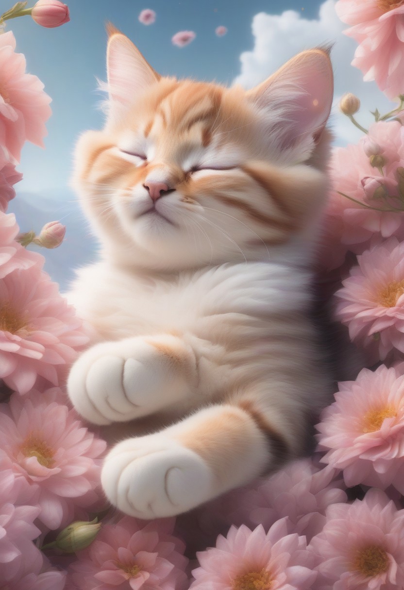 a cute anthro kitten sleeps on a cloud, surrounded by flowers, eyes closed, cozy, high quality, an award winning photo for le magazine, poster