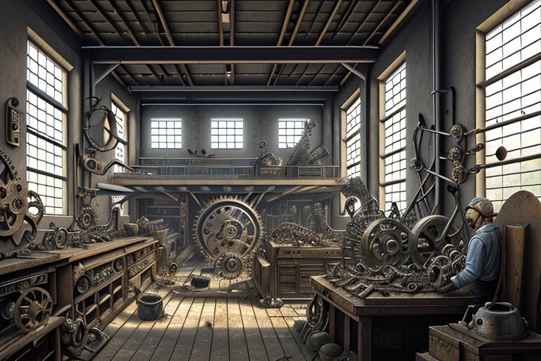 A cluttered steampunk inventor's workshop filled with gears, cogs, and copper pipes. A large mechanical clock ticks on the wall, while the inventor, dressed in a leather apron and goggles, works on a half-finished automaton. Sunlight streams through a window, highlighting the intricate machinery and the smell of oil and metal in the air