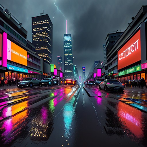 A bustling modern city at night, drenched in heavy rain. Neon lights from towering skyscrapers and billboards reflect off the wet streets, where people in raincoats and umbrellas hurry along the sidewalks. Cars splash through puddles as they drive by, and distant thunder echoes between the buildings, while raindrops streak down glass windows