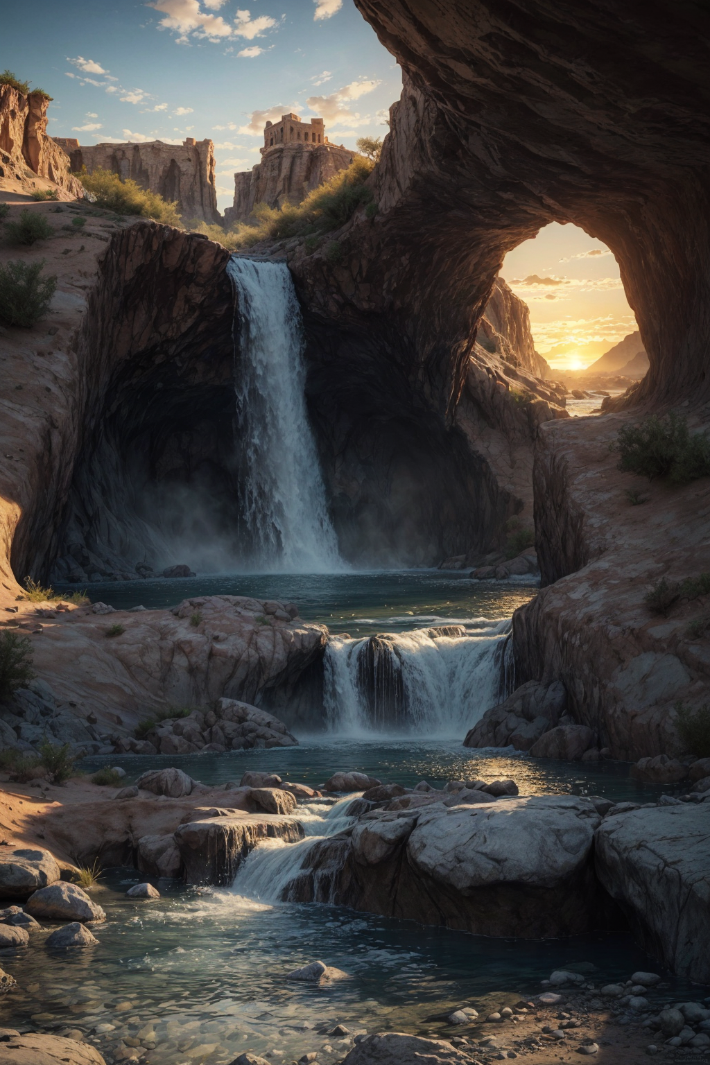 a raw pohot of waterfall, creek, sand fortress, desert, oasis, sunset , colorful, detailed, contrast light, raw, (masterpiece:1.4),( best quality:1.1), (photorealism:1.2), (epic realism:1.2), (8k, 4k quality:1.2), <lora:add_detail:0.6> , <lora:epi_noiseoffset2:1>