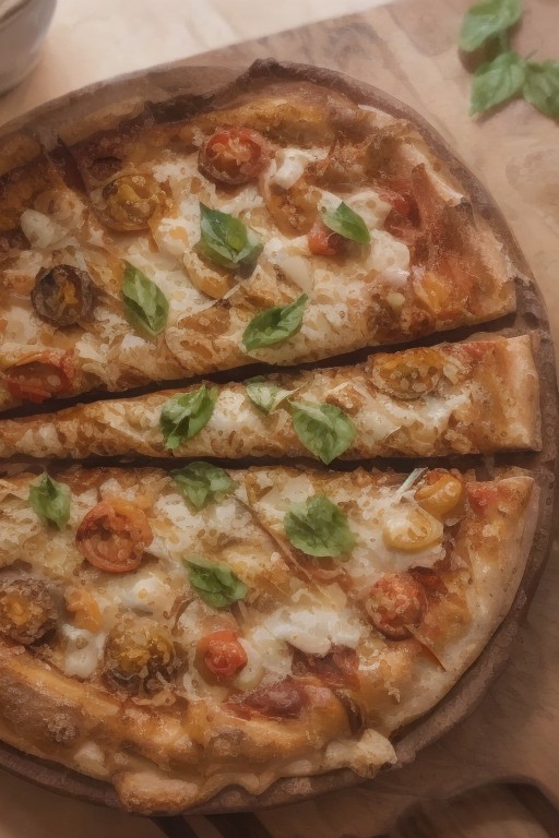 close-up of the most delicious pizza ever imagined. The pizza is a large, wood-fired pie with a perfectly golden, slightly charred crust. It’s topped with melted, stretchy mozzarella cheese that bubbles at the edges, oozing over a tangy tomato sauce. There are generous toppings of fresh basil leaves, spicy pepperoni, mushrooms, roasted bell peppers, and olives, all glistening with a light drizzle of olive oil. The crust looks soft on the inside but crispy on the outside, and you can almost smell the aroma of the freshly baked pizza, foodphoto