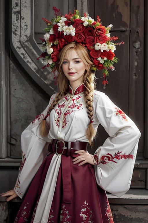 a beautiful girl with blonde hair has a thick braid that goes down over her left shoulder, a red ribbon is tied at the end of the braid. She has a wreath of large red flowers on her head, the wreath on the back of her head has long thin strips of red, white and blue, the gog strips go down next to her face on both sides, the girl is wearing a white blouse with a wider round neckline, the blouse has embroidered roses on the chest there is also such embroidery along the sleeves. the blouse is belted in a burgundy skirt over which there is a black plush apron with embroidered roses, it is a Ukrainian national costume, the girl is captivating and beautiful.