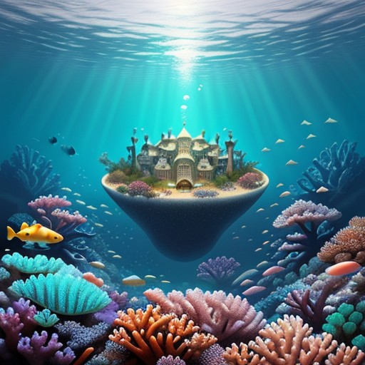 An underwater city built inside a giant bubble, with colorful coral reefs and aquatic creatures swimming nearby.
