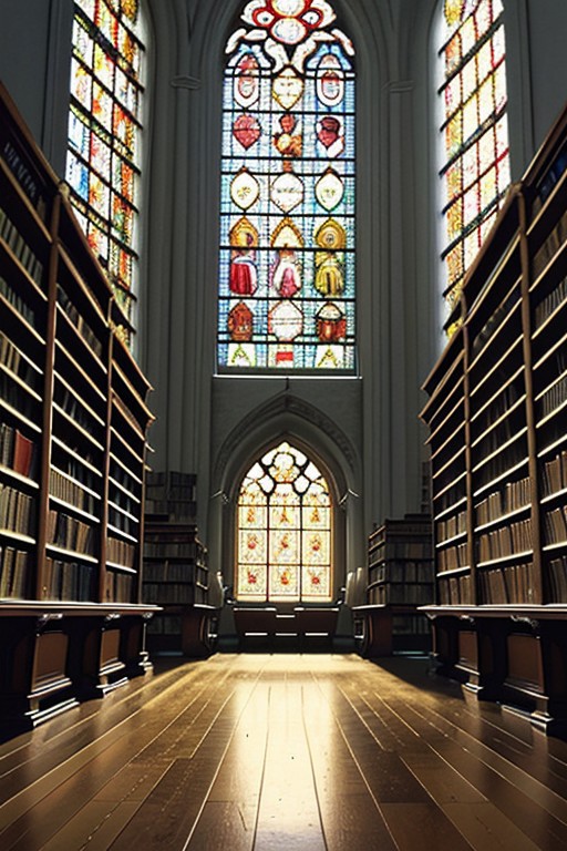A grand, enchanted library filled with towering shelves of ancient books. Some of the books float gently in the air, their pages turning by themselves. Soft, golden light filters in through stained glass windows, casting colorful reflections on the polished wood floors. The scent of old parchment and leather fills the air, and a sense of quiet knowledge and magic pervades the room. The scene feels timeless and full of wonder