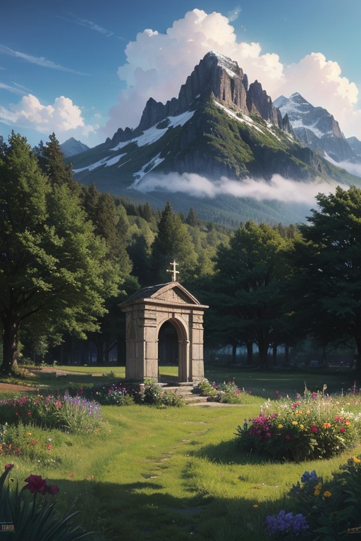 scenery, landscape, digital illustration, mountain vista, flowers, forest, medieval, breathtaking, godbeam, [summer|(snow)], highest quality, highly detailed, masterpiece, best quality, Naturemagic, magical energy, fantasy, (art by John Avon, art by Greg Rutkowski ,art by Donato Giancola )ADDBASE, snowy mountain, clouds,ADDROW clouds, sky, birds, ADDROW verdant field,altar,glade, <lora:Theme_NatureMagic:0.8>