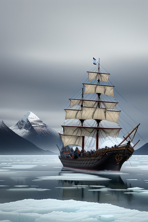 A Viking longship cutting through icy waters, its wooden hull covered in frost. The ship’s sails billow in the wind, and a crew of Viking warriors stand on deck, their shields and weapons ready. In the distance, jagged icebergs float in the sea, and snow-covered mountains loom on the horizon. The sky is cloudy and cold, with snow beginning to fall