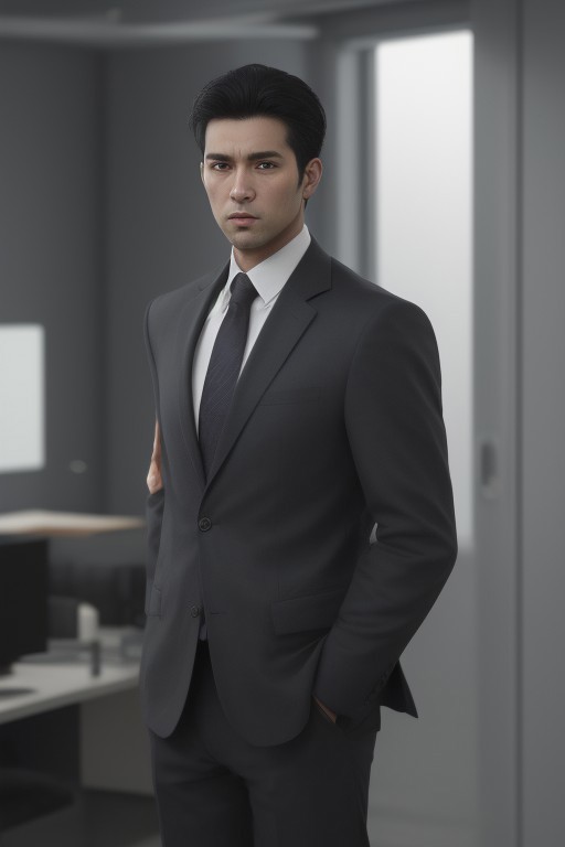 best quality,masterpiece,(realistic:1.2)quality,realistic,masterpiece,Highly detailed,1boy,office man,adult,asian,black hair,suit,standing,hand in pocket,grey_background,moody lighting,full_shot,frontlight,highres,absurdres,incredibly_absurdres,huge_filesize,