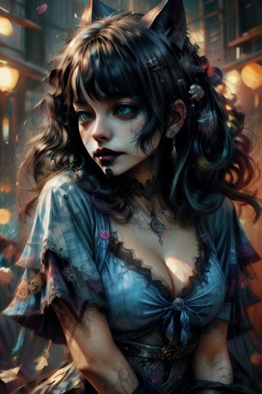 Tie dye burlesque outfit, vibrant colors,cloth,ribbons,lace,pearls, hyperrealistic, ((goth)), blue eyes, oil painting