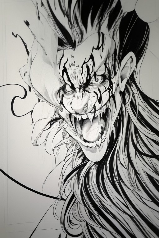 Create an anime-style clown in black-and-white ink. He has messy black hair with white streaks, a bold face pattern, and large expressive eyes. He has a wide smile with dark streaks. He wears a simple patchwork suit and holds a twisted cane. The background is a swirling ink wash.