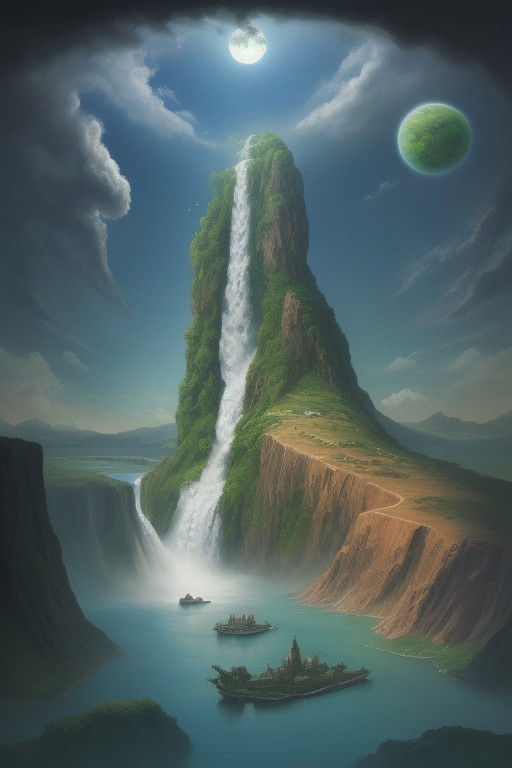Ghiblistyle fantasy oil painting of a lush alien world, there is a large island floating in the sky. There is a majestic waterfall coming from the floating island