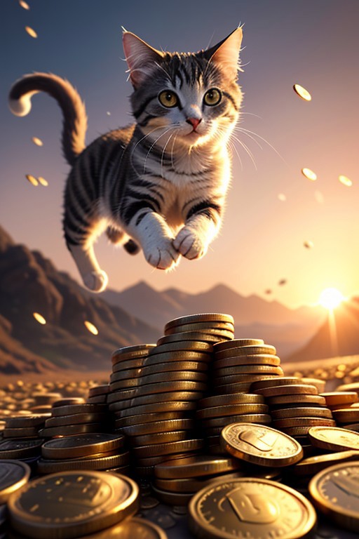 Kitty, jumping, many Gold coins falling from above, closeup, On top of a pile of gold coins, sunrise background, (masterpiece, best quality:1.4), ultra-high res, 4k, 8k, insanely detailed, insanely beautiful, perfect finish,