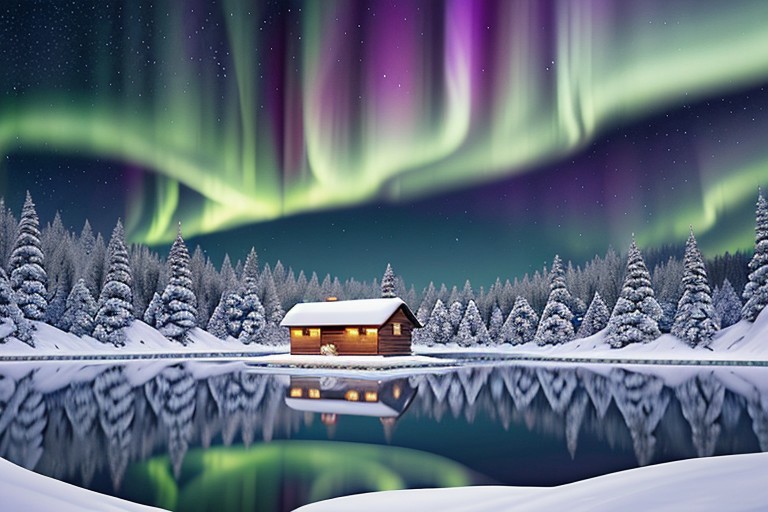 A serene frozen lake surrounded by snow-covered pine trees, with the Northern Lights dancing across the night sky in vivid green, blue, and purple hues. The ice on the lake reflects the celestial colors, while the sky is dotted with bright stars. A small cabin with smoke rising from the chimney sits on the shore, casting a warm glow in the cold, silent night