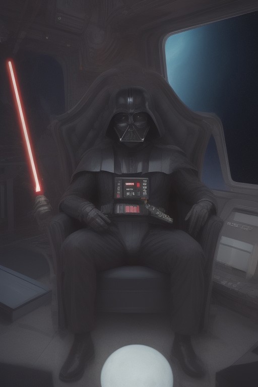 Darth Vader is leaning back in a leather chair smoking a cigar. He’s on the bridge of a space ship with floor to ceiling windows. There’s a large planet and the galaxy in the background. He has a big smile on his face.