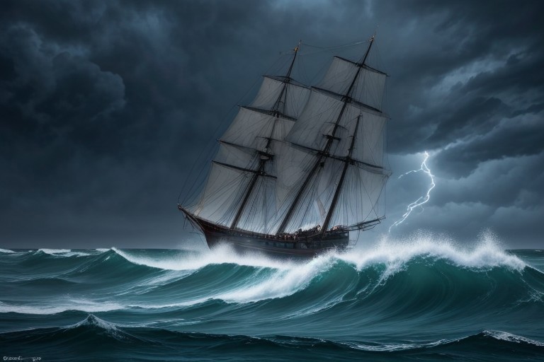 A large Viking longship battling rough, stormy seas, with waves crashing against the sides of the ship. The sky is dark with storm clouds, and lightning strikes illuminate the scene. The crew of the ship, dressed in furs and armor, struggle to keep the ship steady, while a fierce wind fills the sail and drives them towards the unknown