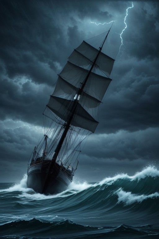 A large Viking longship battling rough, stormy seas, with waves crashing against the sides of the ship. The sky is dark with storm clouds, and lightning strikes illuminate the scene. The crew of the ship, dressed in furs and armor, struggle to keep the ship steady, while a fierce wind fills the sail and drives them towards the unknown